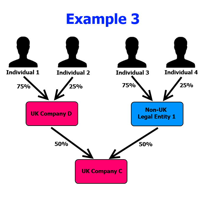 So UK Company D will appear on the PSC register of UK Company C as it holds 50% of the shares and voting rights. Because Company D is already listed on the register, neither Individual 1 nor Individual 2 appear on Company C’s PSC register.