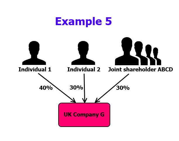 In Example 5, because the joint shareholding exceeds 25% of the shares and voting rights, each of the joint shareholders A, B, C and D who hold the shares jointly must appear on UK Company G’s PSC register (alongside Individuals 1 and 2). That’s despite the fact that, unlike the individual shareholders, they share the rights between them.