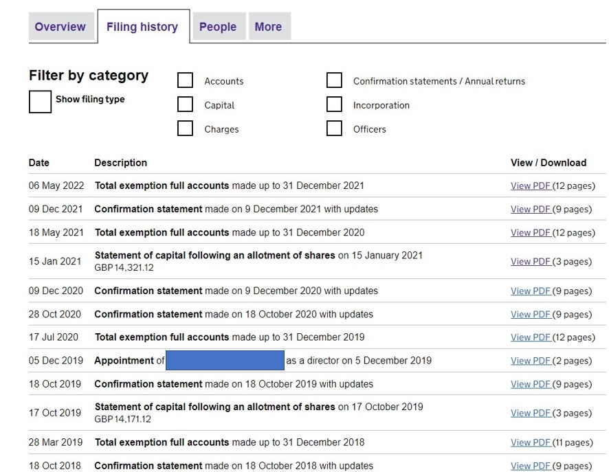 - Filing history: accounts, confirmation statements, changes of details, and other filings the company has made