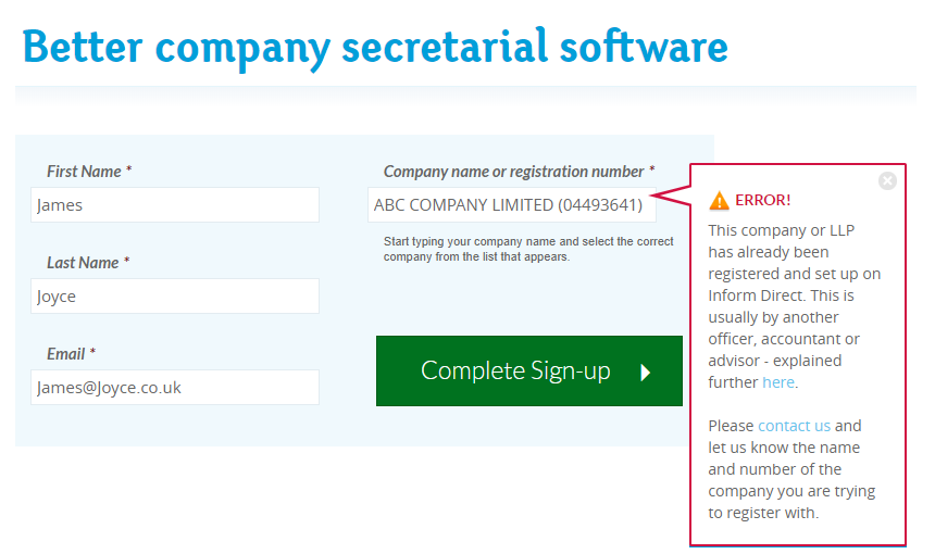 It is possible that your company is already registered with Inform Direct by someone else, this is usually: