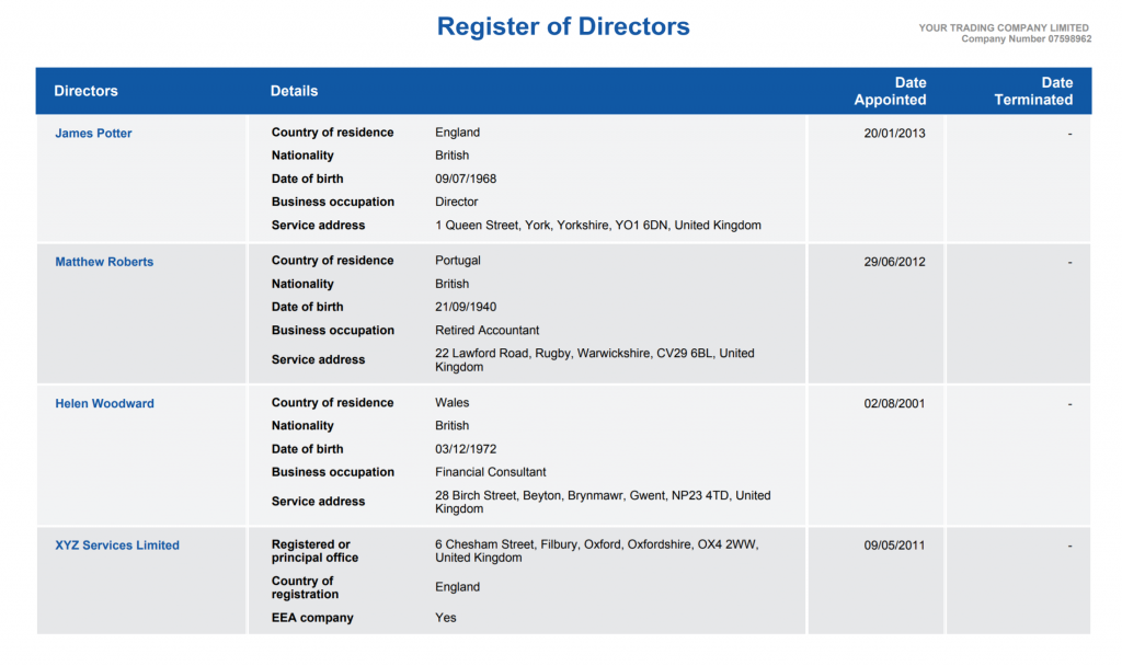 If you do appoint a corporate director, they must also be recorded in the directors register with the following details: