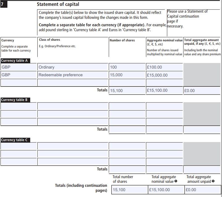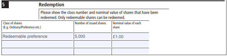 These examples of sections 5 and 7 show where a company has redeemed 5,000 of its existing 20,000 redeemable preference shares.