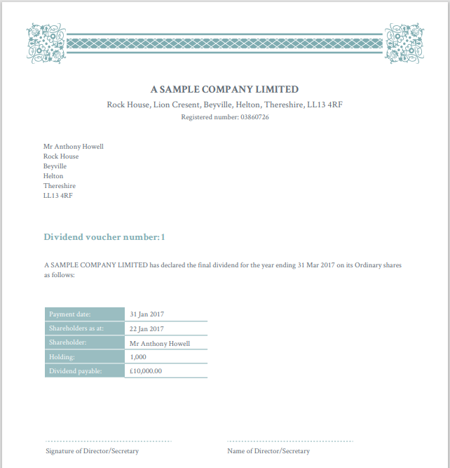 For a joint shareholder, it’s still good practice to include the name of each separate holder on the dividend voucher. However, only the address of the first named joint holder needs to be shown. You also only need to produce and send a single dividend voucher for a joint shareholding. That voucher will be sent to the first named holder, rather than a dividend voucher to each joint shareholder.