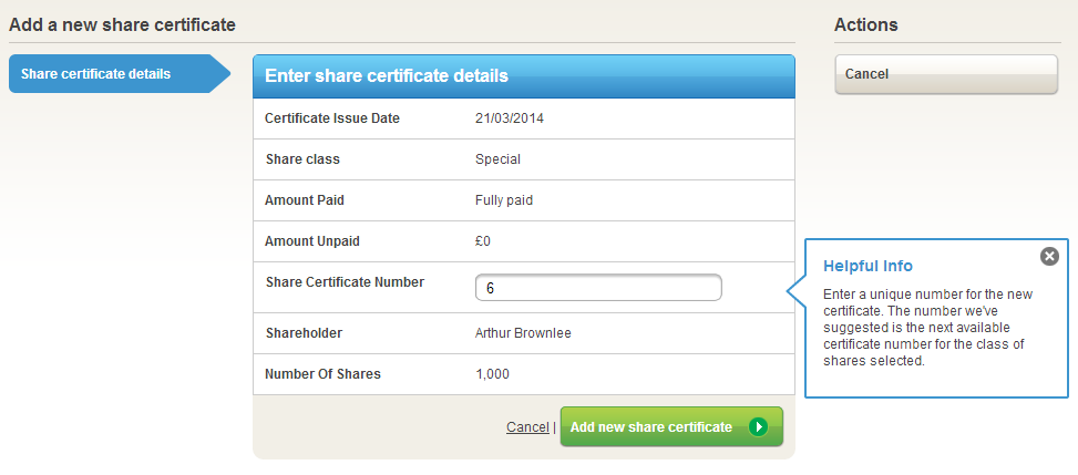 When you process share transfers, you also have the option to produce a share certificate at the same time. As you’ll have entered any required details for the transfer itself, you won’t need to enter them again. Just provide a number for the new share certificate and it’s ready to print and sign. Alternatively, you can just record the transfer and create share certificates later on. It’s up to you.