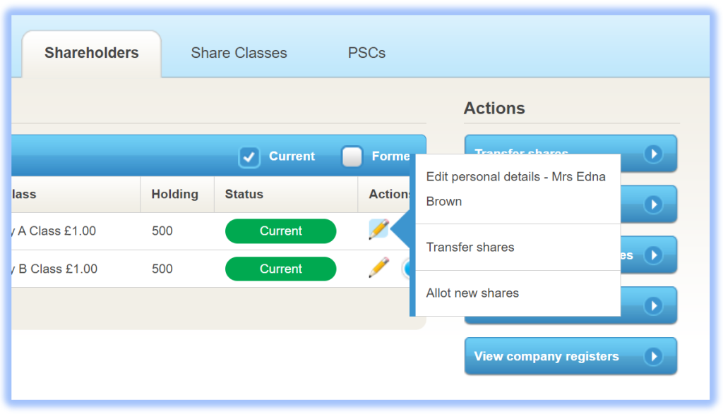 To start the new share transfer process you just click on the pencil next to the shareholding that’s being sold. You’ll be given the option later of whether you want to transfer all or just some of the shares, so for now all you need to select is “Transfer shares” from the list of options that appears.