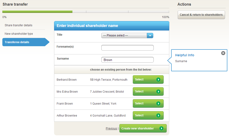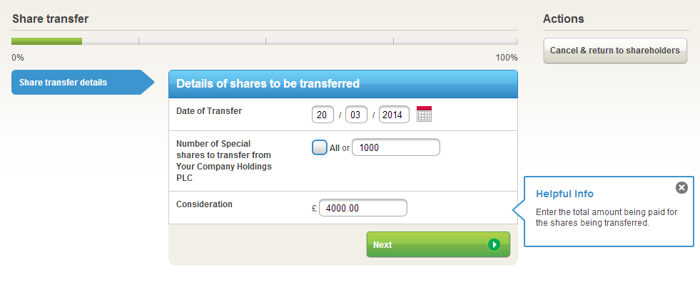 Our share transfer wizard, like all processes in Inform Direct, is split up into easy bite-sized steps. Based on what you enter, the system identifies the correct questions to ask – so you won’t waste time filling in unnecessary information or working out which details you need to complete. Help is available at each step of the share transfer process if you’re unsure what something means or what you need to include.
