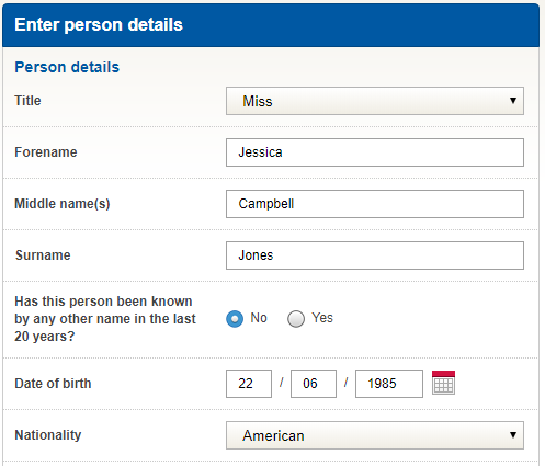 Initially you will need to input the person’s details and then applicable addresses.