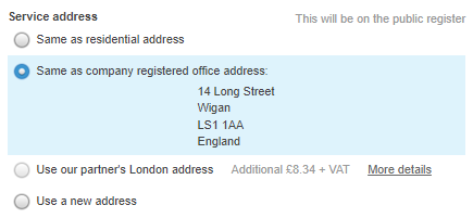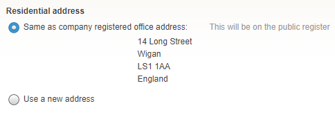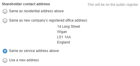 - You can select the company registered office address or the shareholder’s residential address. However, be aware that if you select a residential address it will be displayed on the public record.