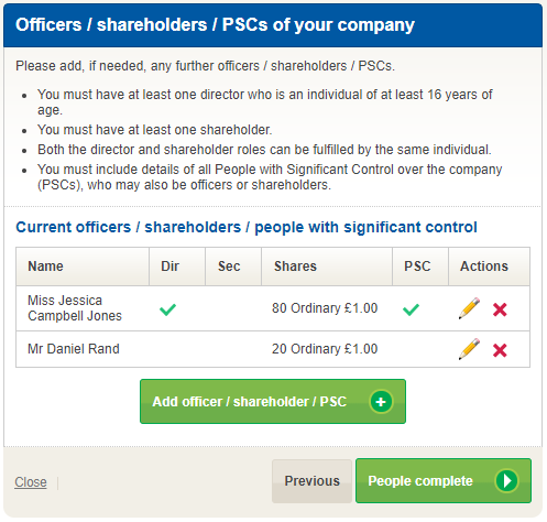 In this step you will enter details of the company’s first officers, PSCs and shareholders. A company’s officers are its formally named directors and if you have one, the company secretary.