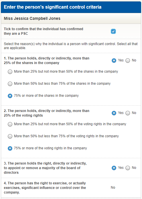 Confirmed they are a PSC – select to indicate that the person has confirmed that they will be a PSC of the formed company.
