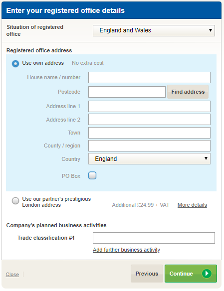 - Once you have completed your address, including the postcode field, press “Continue” to progress with your online company set up.