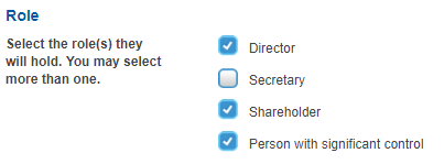For each officer/shareholder/PSC start by selecting ALL the roles they will hold: