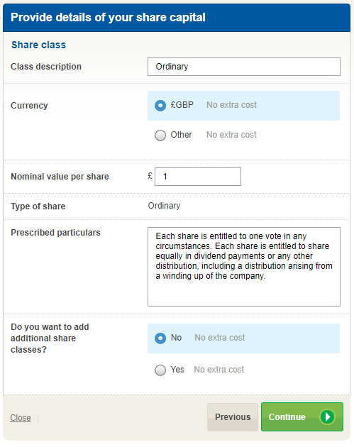 - Most companies are formed using the standard set of prescribed particulars for ordinary shares in the model Articles of Association. If this applies to your set up company, simply click “Continue” to confirm the default wording. You can also overwrite with your own words, but they should comply with the model Articles of Association that we will automatically submit to Companies House to support your company registration application.