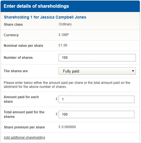 Amount paid – enter either the amount paid per share, or in total and the system will calculate the share premium paid (if any).