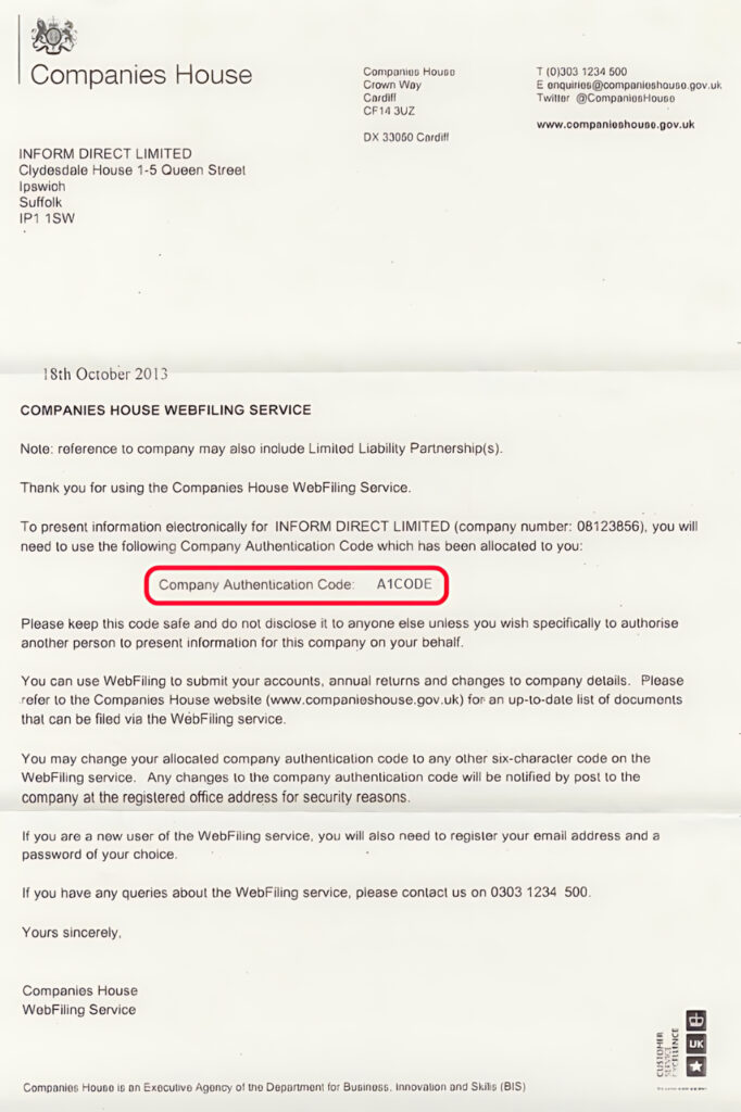 Regardless of how you formed your company, you will receive a letter from Companies House. This will be sent to the registered office address of the company and displays the authentication code as shown below: