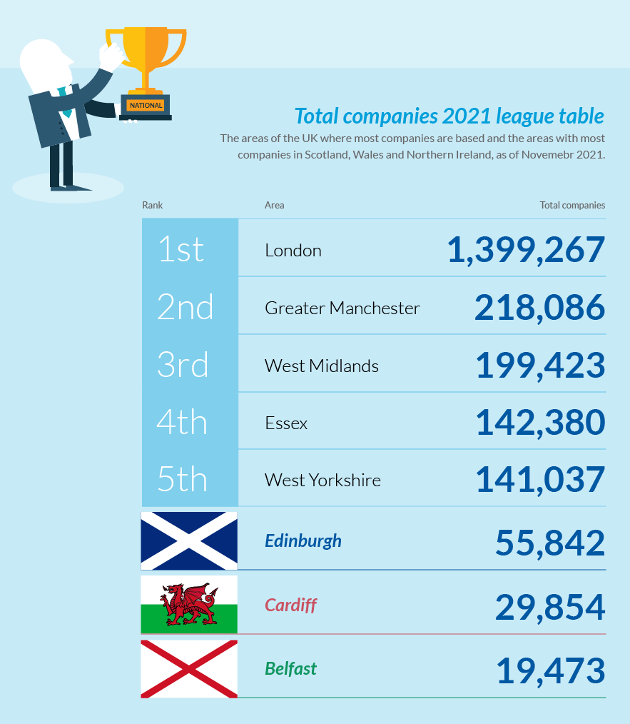 In our Annual Review of Company Formations published each January, we maintain a league table of the areas of the UK where most companies are based. Since we started compiling the data in 2014, the top 5 areas have remained constant as London, Greater Manchester, West Midlands, Essex and West Yorkshire. Edinburgh, Cardiff and Belfast have been in the top spots for their respective nations.