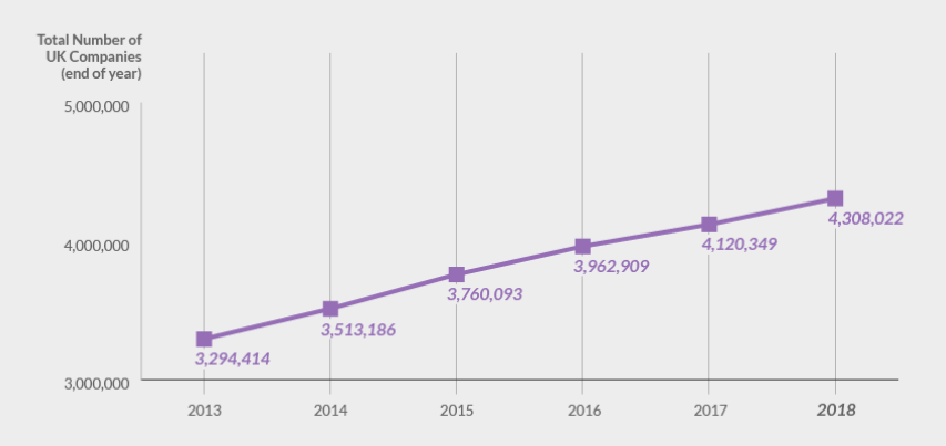 There were 669,855 companies formed in the UK in 2018. That’s up from 634,116 in 2017, and also ahead of the previous record figure of 664,720 in 2016.
