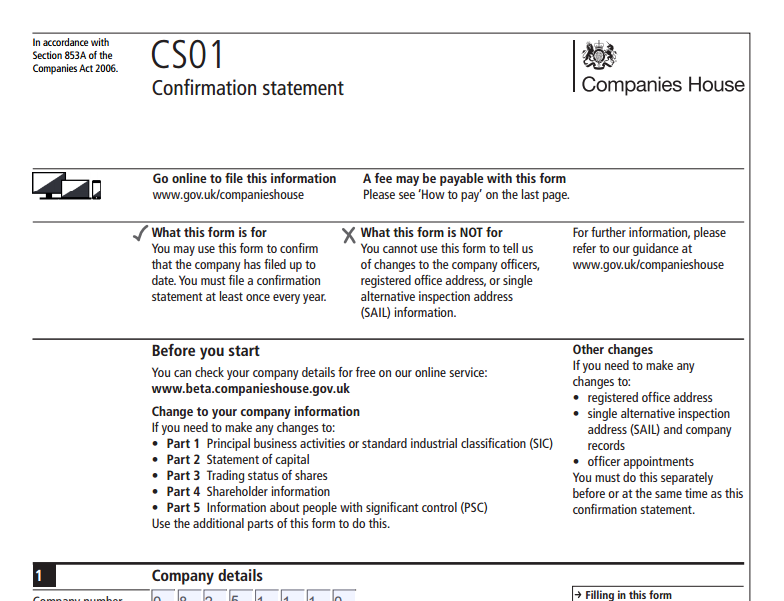 The CS01 form should be accompanied by a cheque made payable to “Companies House”.