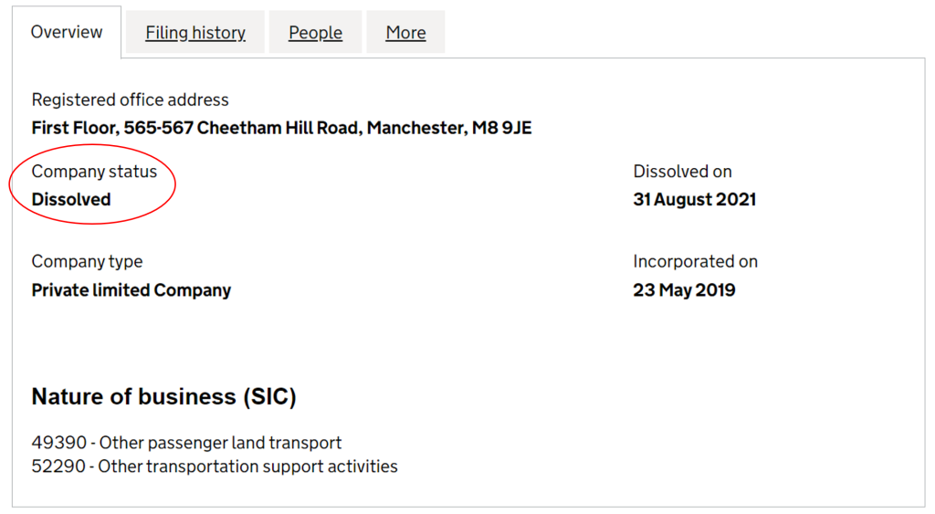 The registry page for the company will now say ‘Company Status: Dissolved’ and give the date of dissolution.
