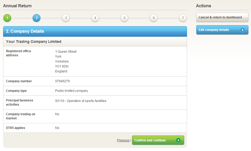 Inform Direct will electronically retrieve all your company details from Companies House and automatically populate your Annual Return. If Companies House’s records are up to date you won’t need to spend time manually entering your company details and they will be presented in the correct format automatically. For most steps in the Inform Direct Annual Return process, all you will need to do is review your company details to ensure that there have been no changes and press “Confirm and continue” to move on to the next step.
