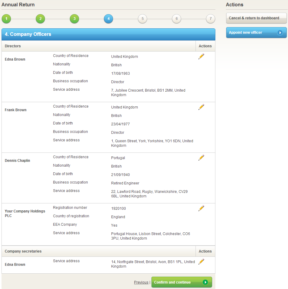 Our straightforward system will guide you as you enter the appointment details. When complete a screen will inform you of the changes you have made and at the press of a button the update will be filed with Companies House. You can then continue and complete your Annual Return. No paper forms are needed, your updates have been registered immediately with Companies House and completion of the task in hand – your Annual Return – is not delayed.