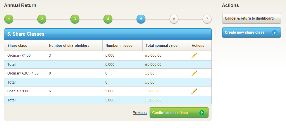 All you need to do is check that the details are correct and press “Confirm and continue”. If you have created a new share class during the year and have not informed Companies House of the change, then you can do so at Step 5, simply by pressing “Create new share class” and entering the new details.