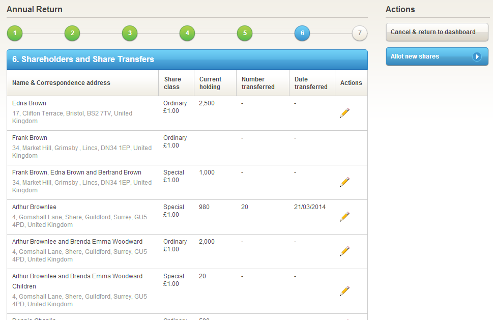 Similarly, pressing the “Allot new shares” button at Step 6 of the Inform Direct Annual Return wizard allows you to make updates to reflect share transfers or allotments during the period. Once you have confirmed the changes they are sent instantly to Companies House and you can continue and complete your Annual Return.