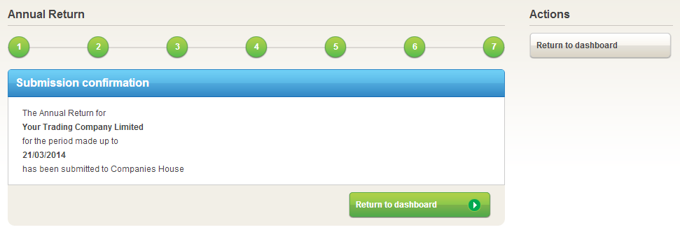 If these reminders are a little too late for you this time, don’t worry. Our intelligent software can even help you file your overdue Annual Return. If the made-up date of your Annual Return has passed, Companies House will still require that you complete your Annual Return to this date. Our software will automatically work out the date to which your return should be completed and only include company changes made during this period. Our step by step process will help you complete your Annual Return in minutes and file it electronically in an instant.