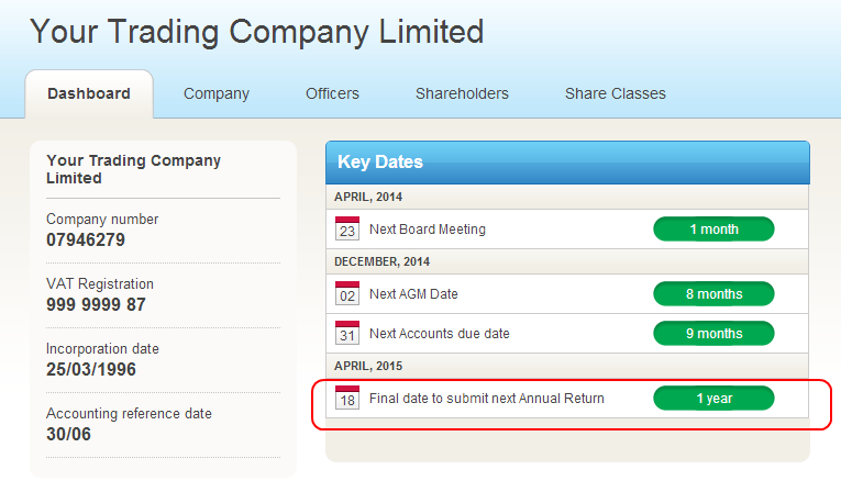 - Your company dashboard highlights key filing deadlines, including the due date of your Annual Return.