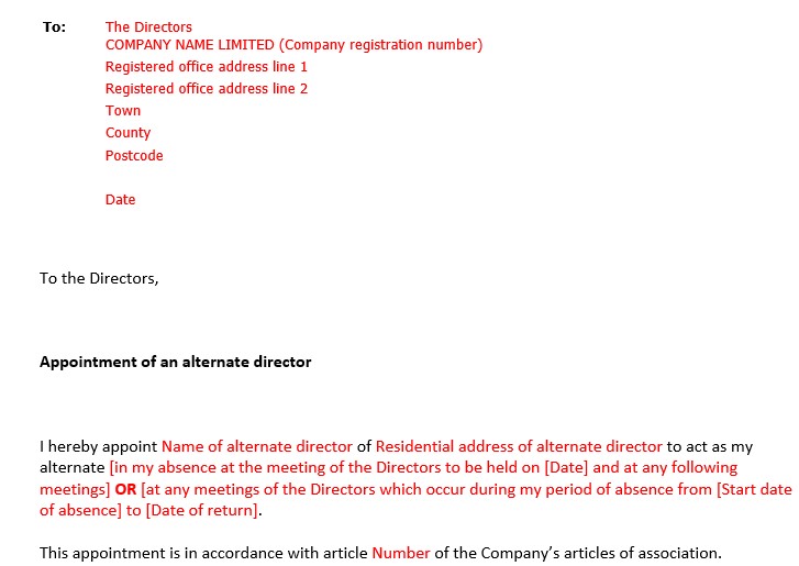 A letter from a director to the company informing them of the appointment of an alternate director to act in their place during an absence.