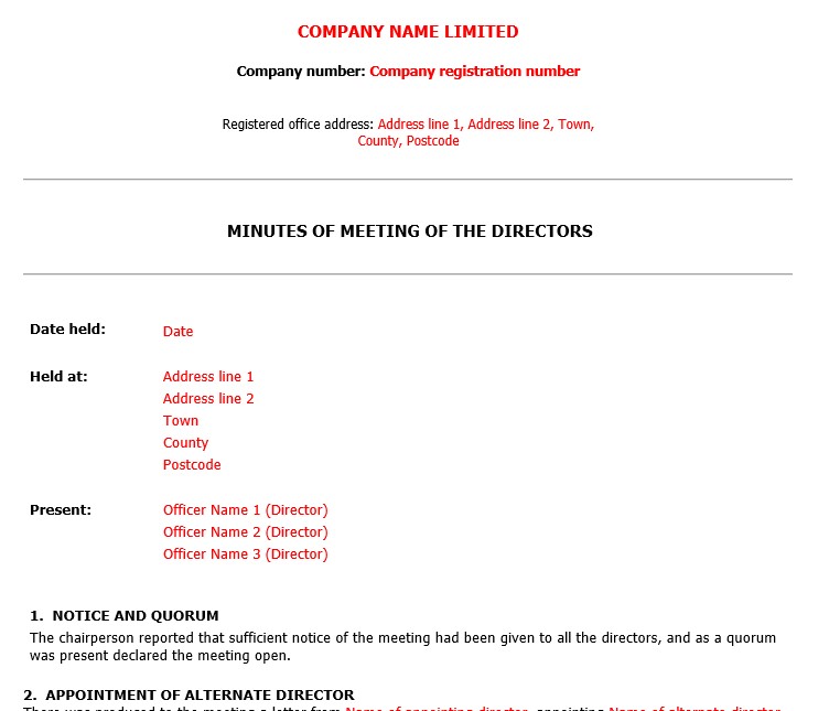 When a company director expects to be absent from a meeting, they may appoint an alternate director to act in their place (provided that the articles of association permit it). This is a template for a board meeting minute to appoint an alternate director.