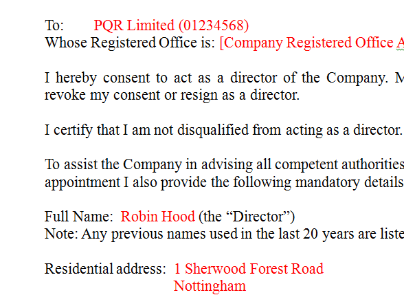 This template can be amended to record the consent to act of a new individual director or secretary appointment.