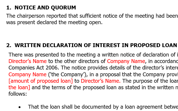 These template board minutes can be used to document discussion of a proposed company loan to a director, and if the directors' are satisfied that the loan is in the best interests of the company, to document board approval of the loan.