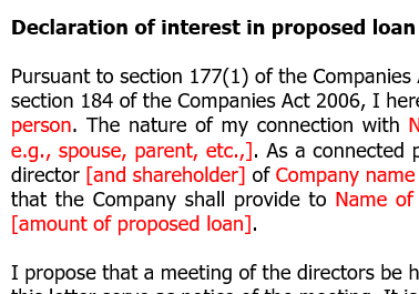 This template is for use when the proposed loan is to a person 'connected' to the director and can also be used to propose a meeting of the directors to consider the planned transaction. It is fully editable.