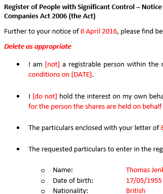 This template reply letter can be adapted by an individual who receives a section 790D notice, enabling them to provide the required details to a company about their PSC status.