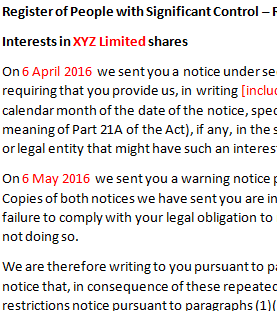 If someone doesn't respond to a formal request for information, the company may look to apply restrictions on shares or rights. As part of that process, the company must first issue a warning notice.