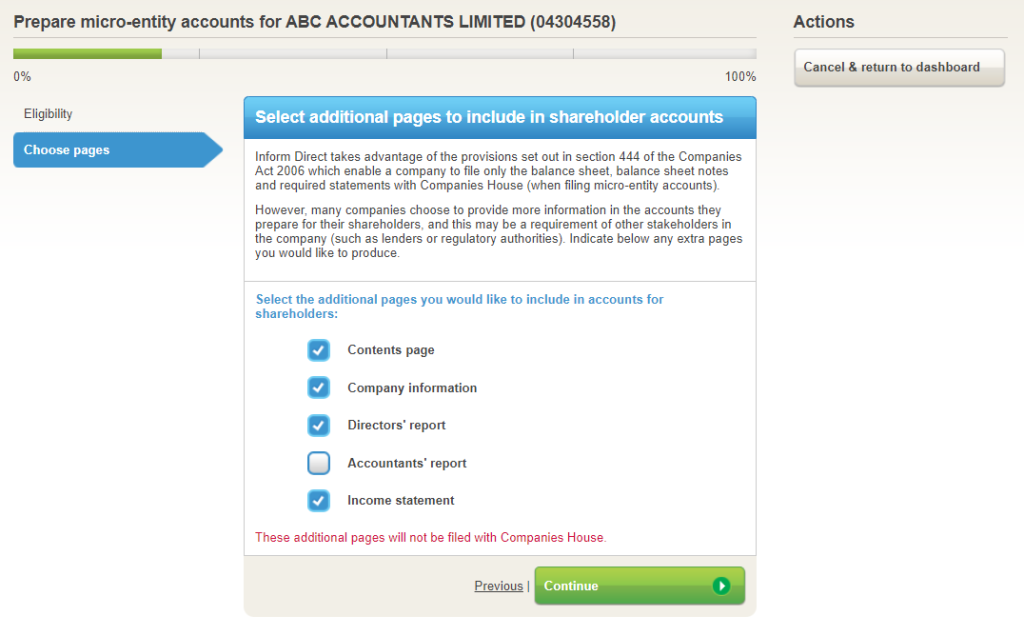 Inform Direct automatically takes advantage of provisions set out in section 444 of the Companies Act 2006 and only files the required pages with Companies House. The required pages are: