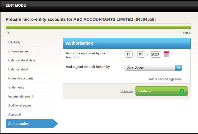 A template board minute pre-populated with the information you entered during the wizard process is available. You can use this to record the directors’ approval of the accounts.