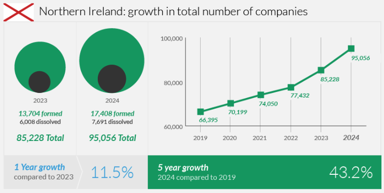One of the biggest success stories was again in Northern Ireland. Growth of 11.5% in company numbers was spurred by a record 17,408 new incorporations, coupled with lower than half that number dissolved in the year. That’s the best ratio of formations to dissolutions anywhere in the UK, and meant the number of companies based in Northern Ireland surged to a new total of 95,056.