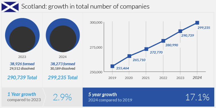 Scotland was home to 38,273 new companies, bringing the total number of companies to an all-time high of 299,235. However, it also saw a record number of dissolutions with 30,189, limiting the growth figure to 2.9% over 2023. The drag of high dissolutions perpetuates a trend of slower growth in Scotland than other areas, with the five-year growth of 17.1% in the number of Scottish companies significantly lower than the other nations of the UK.
