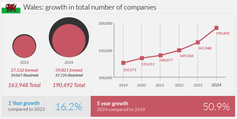 Wales witnessed a 16.2% increase in companies compared to the end of 2023. Figures for the corporate population in Wales are, however, often skewed by the Registrar temporarily changing the registered office of companies based elsewhere in the UK to one of its addresses in Cardiff, where Companies House is based.