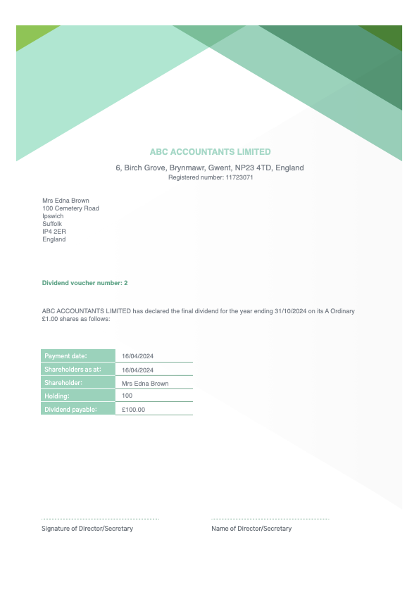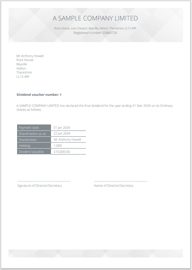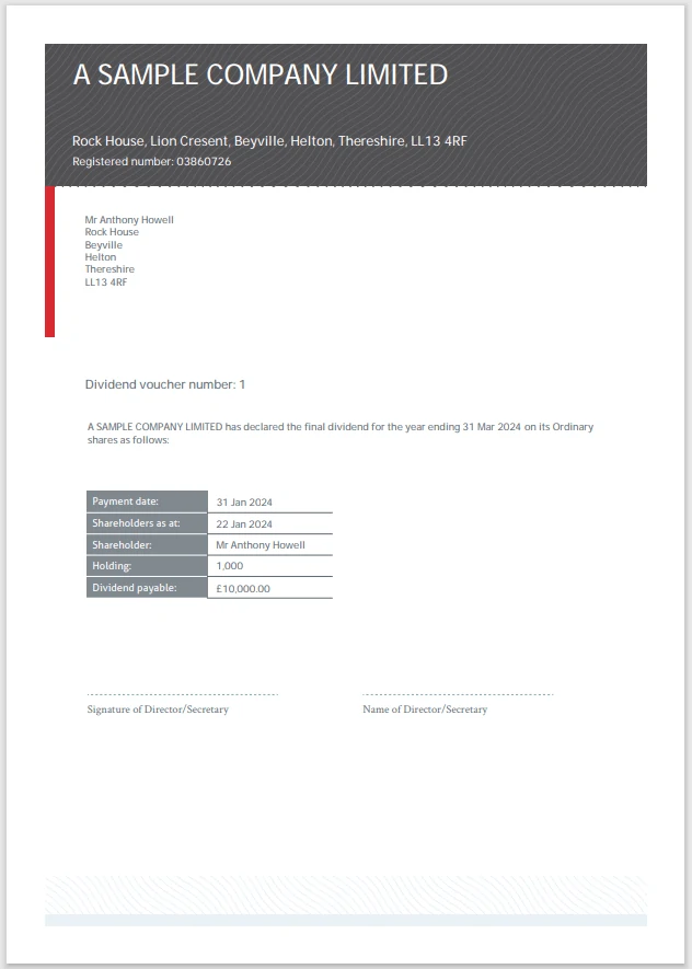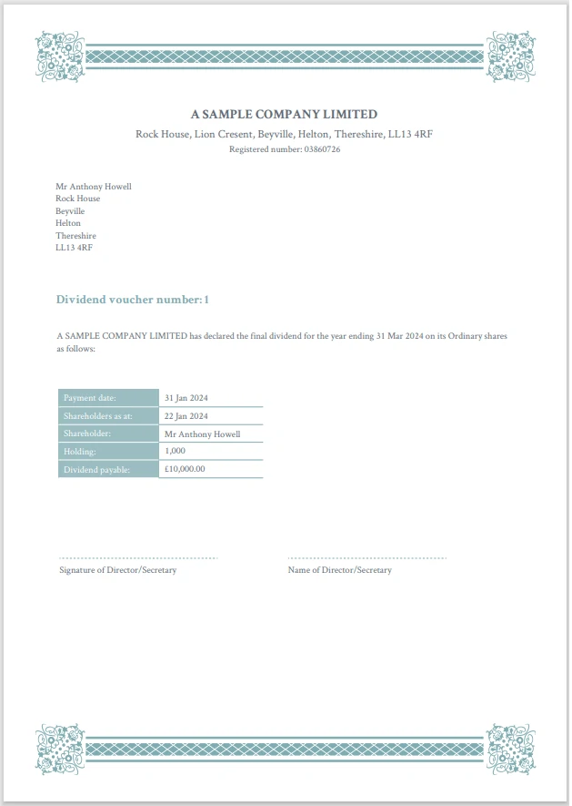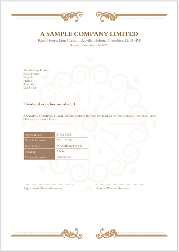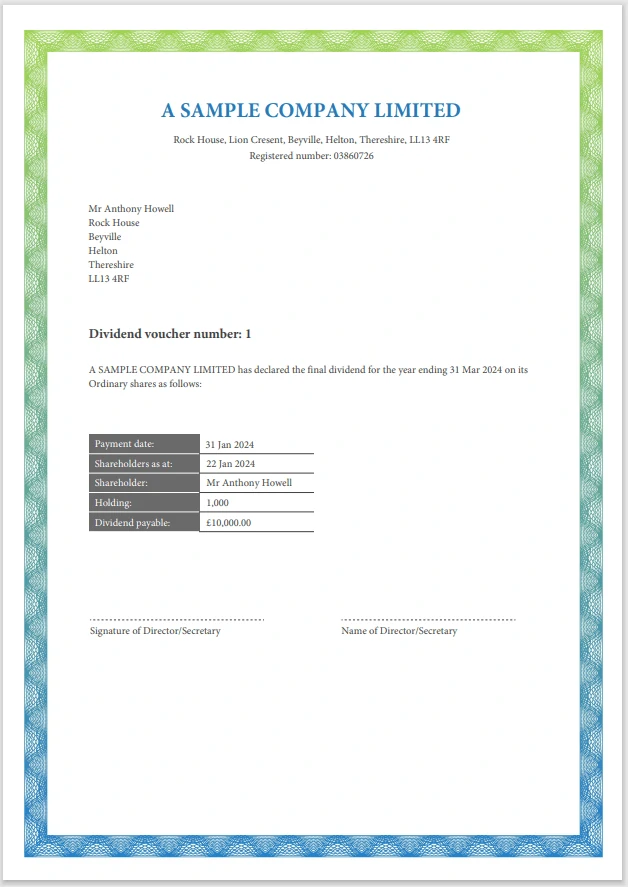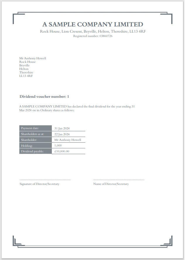 In a fully compliant template, it automatically includes all the details of the dividend being paid, the names of the directors and other company information.
