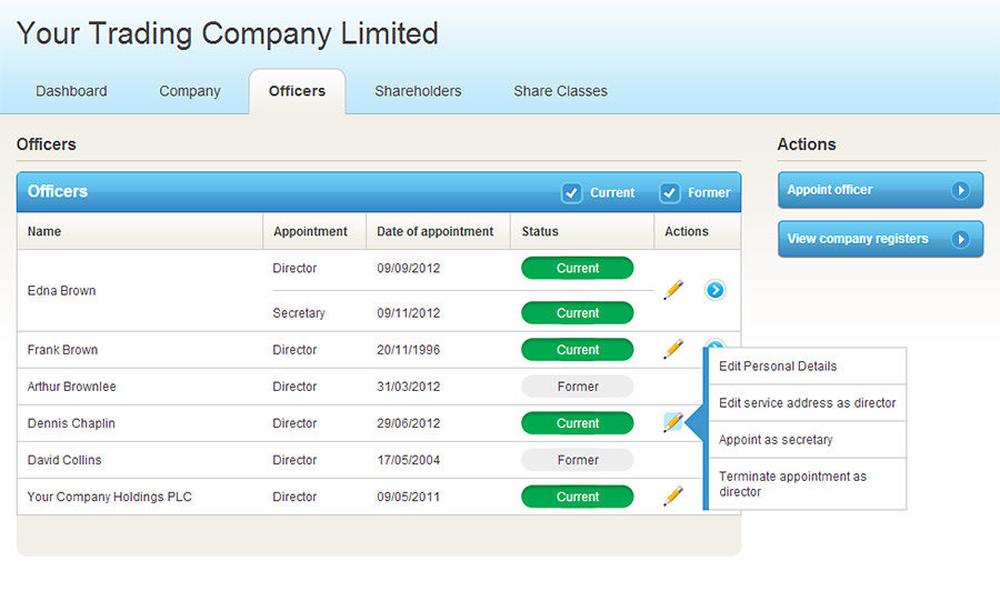 We’ll also automatically update your company registers so you only have to enter information once – there’s no more need to maintain paper copies of your Register of Directors, Register of Secretaries or Register of Directors’ Residential Addresses. Details of all former officers are retained for easy reference.