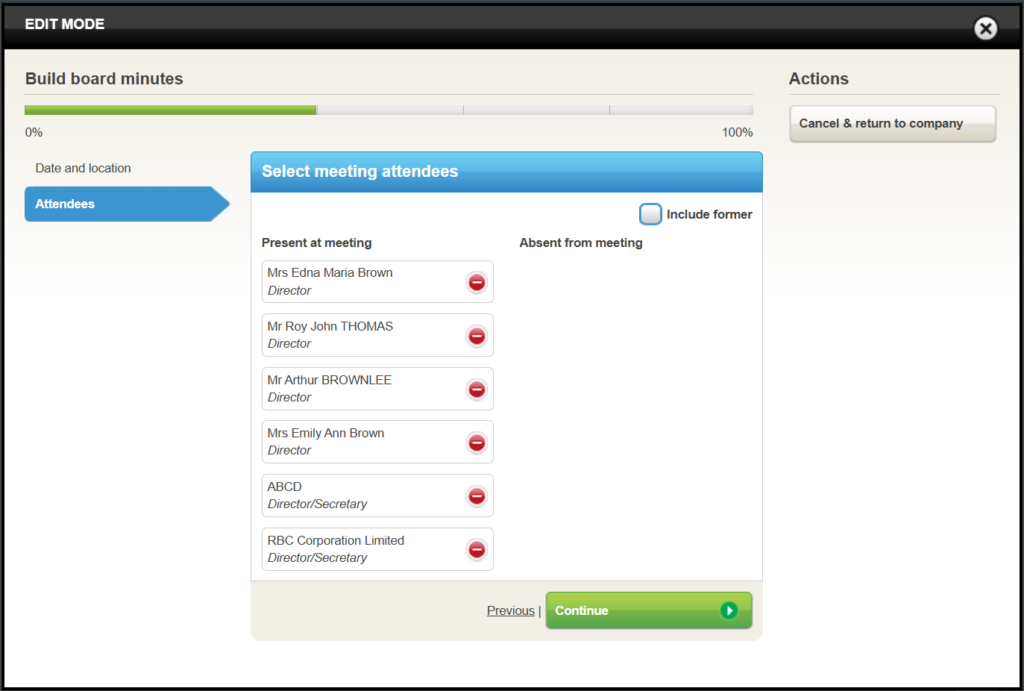 The attendees will be pre-populated with the active officers at the date of the board meeting, but amendments can be made if an officer was not present.