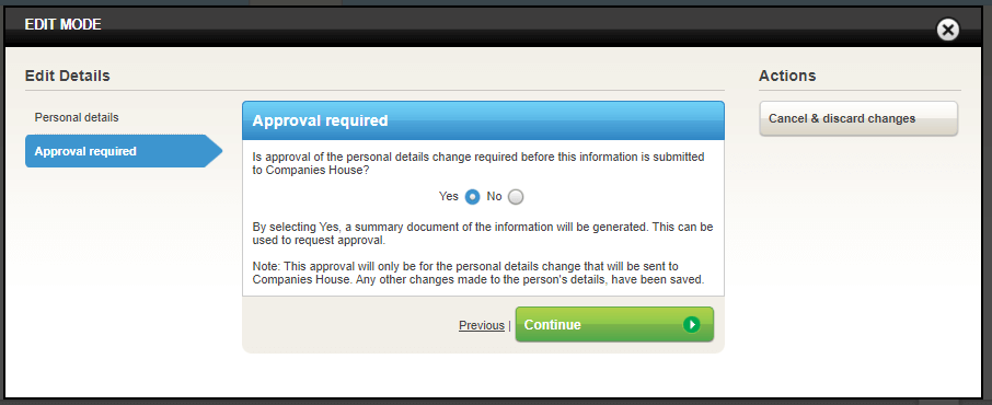 When a change is made in a confirmation statement period that had already been confirmed (e.g. officer appointment, change of personal details etc.), as a subscriber to the software, you will now be presented with the option to save the change for approval.