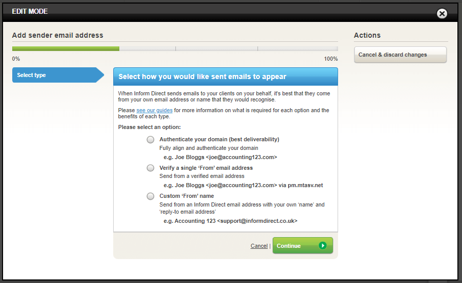 - Authorise emails to be sent from your domain – this is the best option for deliverability and client familiarity