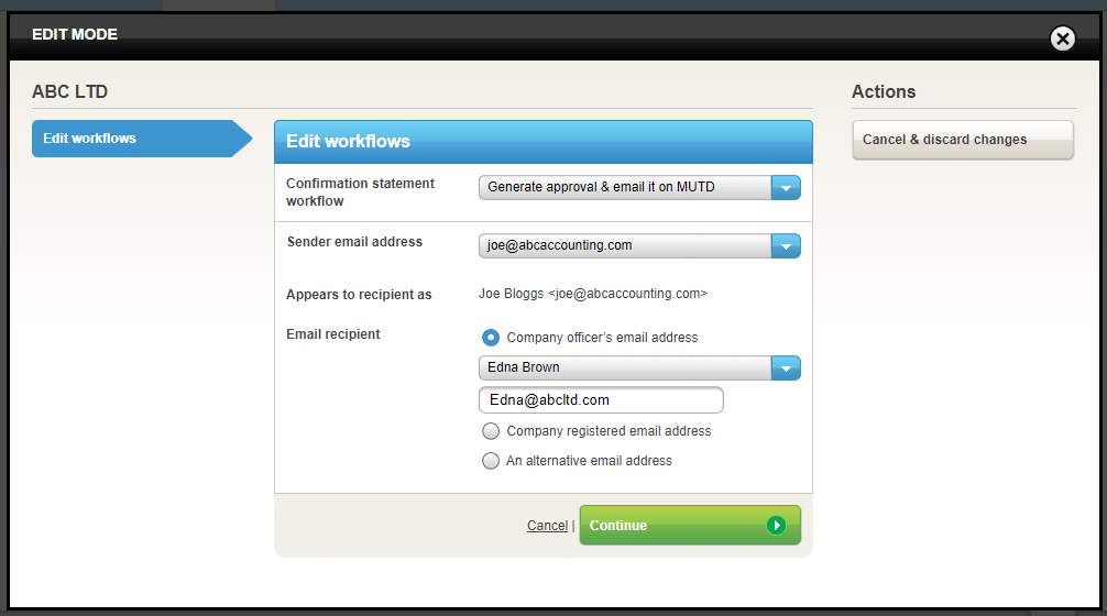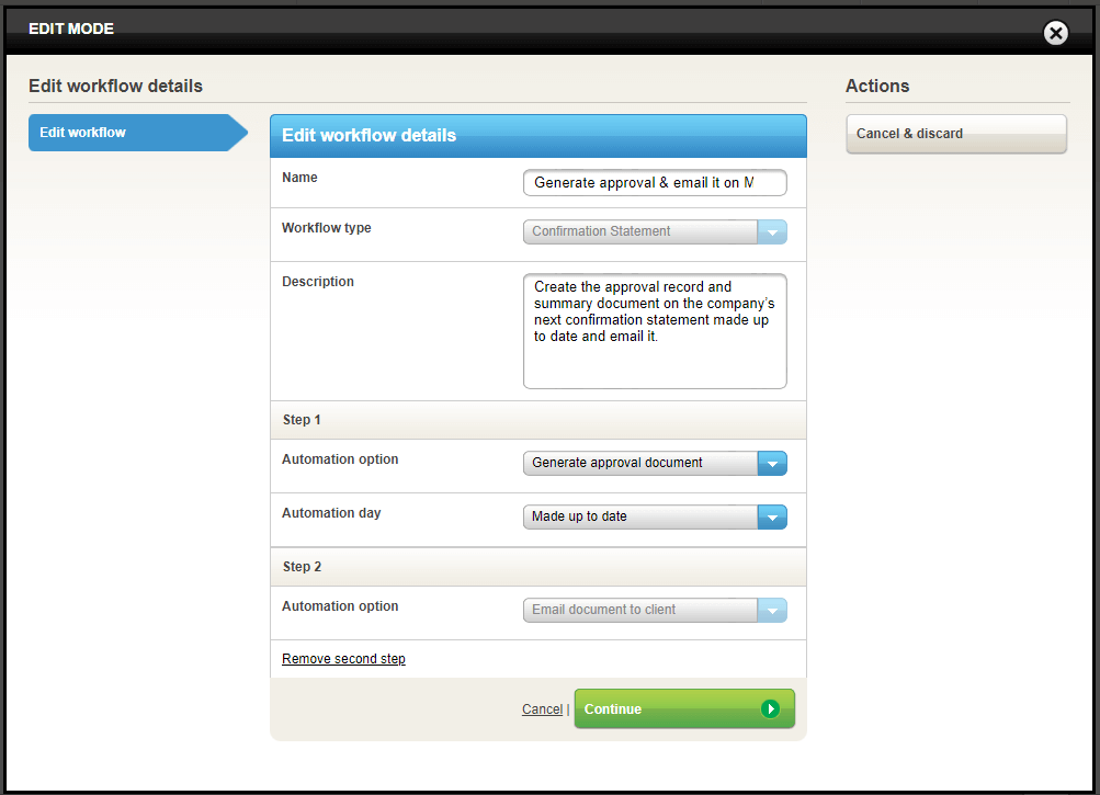 There is now a new automation available for the second step of confirmation statement workflows. This is only available where the first step of the automation is ‘Generate approval document’.
