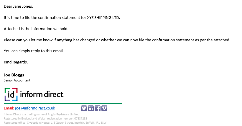 Once you have such a workflow set up for your companies, when the scheduled day arrives for a company the confirmation statement approval document will be emailed to the recipient (see an example below).