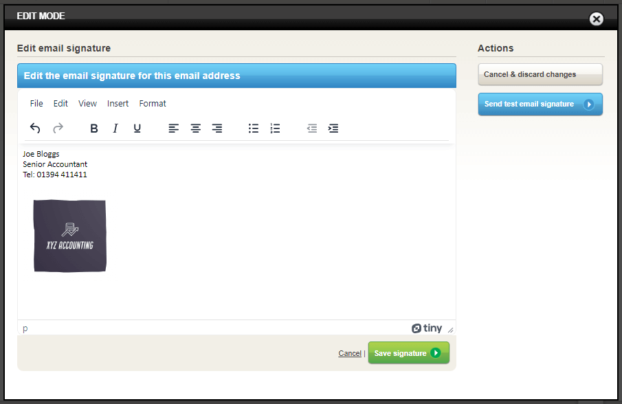 You can configure this to include the text you would normally have in your email signature including any images such as your company’s logo.