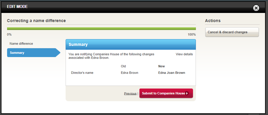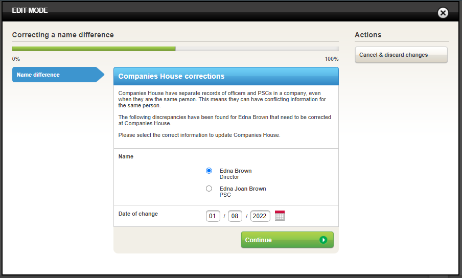 Just select the notification’s action of ‘View and resolve’ and it will launch a new process to let you select the correct name / address for the person, enter the date of change and then submit this change to Companies House for the record that needs correcting.